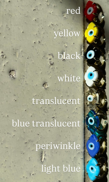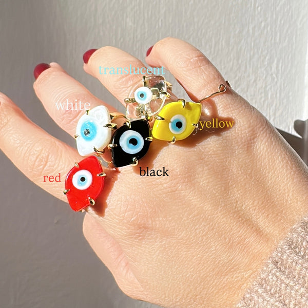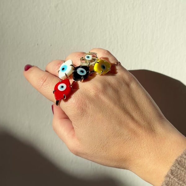 Each ring features a hand-set glass evil eye, symbolizing protection and good energy, mounted on an adjustable gold-plated band for a comfortable, customizable fit.