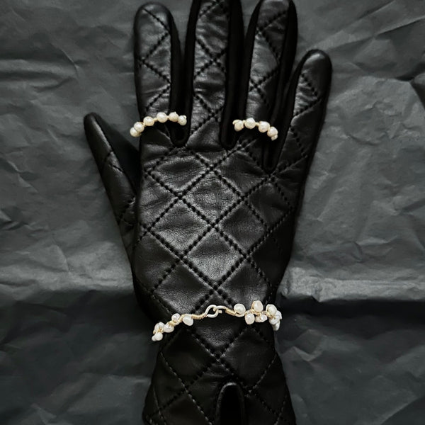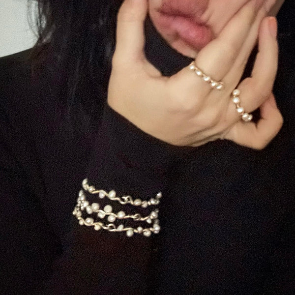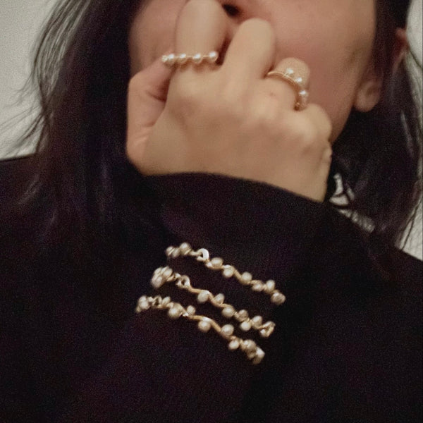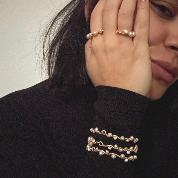 Each bracelet and ring is handwired with irregular freshwater pearls, chosen for their organic shapes and soft luster. No two pieces are ever exactly alike, making every Margot unique. The subtle mix of tones adds a modern edge to a classic material, creating a piece that feels both refined and undone.