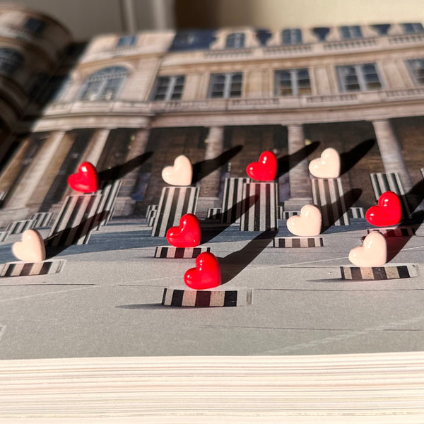 Available in classic red and soft blush, these petite heart studs are perfect worn solo, mixed and matched, or stacked across multiple piercings.